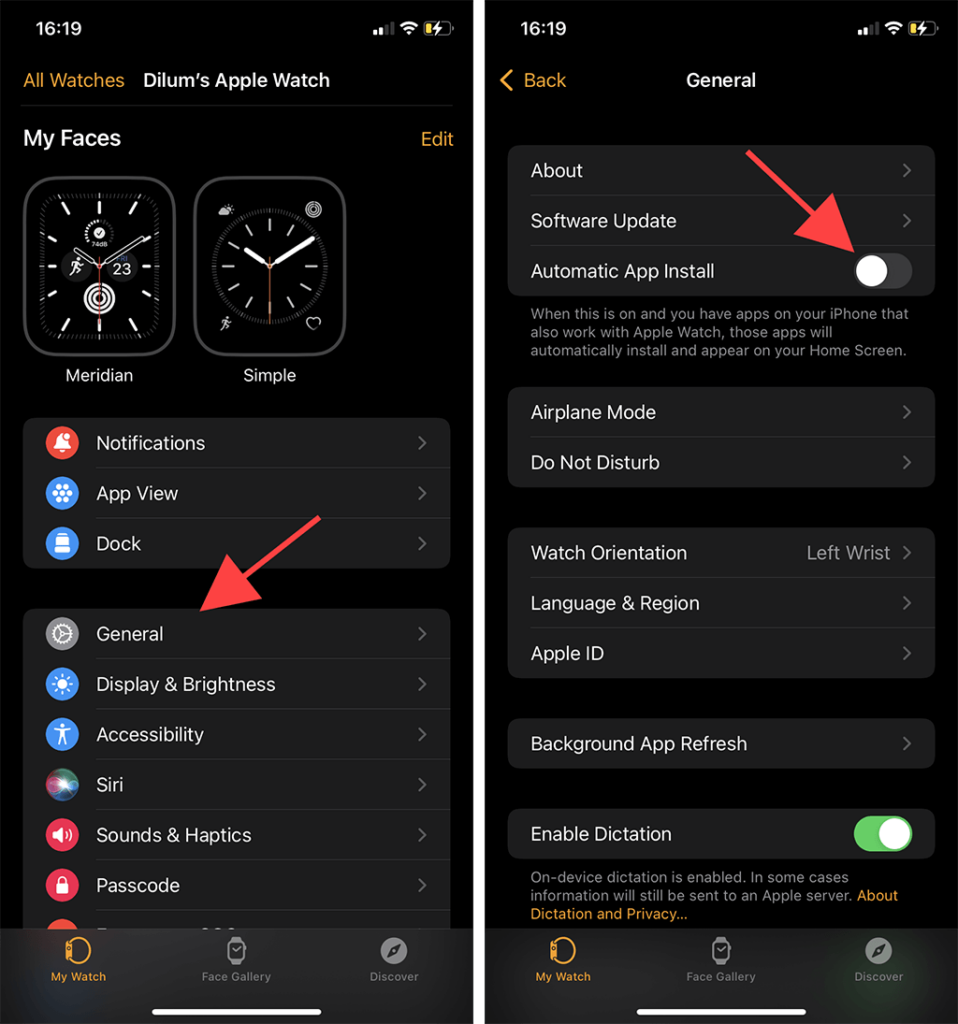 Подсказка: Вы также можете нажать «Общие» на этой странице, чтобы включить «Автоматическую установку приложения». Когда эта функция включена, любое приложение, которое вы загружаете на свой iPhone и которое имеет совместимое приложение для часов, будет автоматически установлено на ваши часы. Отключите это, если хотите сэкономить место на часах и выбирать приложения вручную.