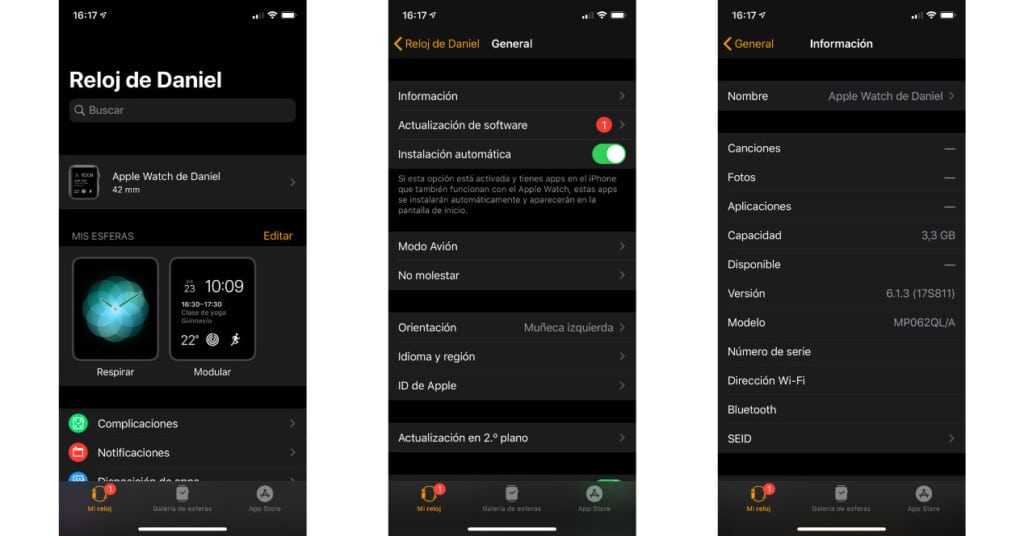 Если по какой-то причине вы не знаете, какое поколение Apple Watch у вас есть, вы можете зайти в приложение на своем iPhone. Внутри него, в меню Обзор > Информация Вы сможете увидеть много данных, таких как общая и доступная емкость. Кроме того, вы также сможете проверить другой серийный номер, относящийся к модели и поколению, который вы увидите в поле. Модель после нажатия пальцем: