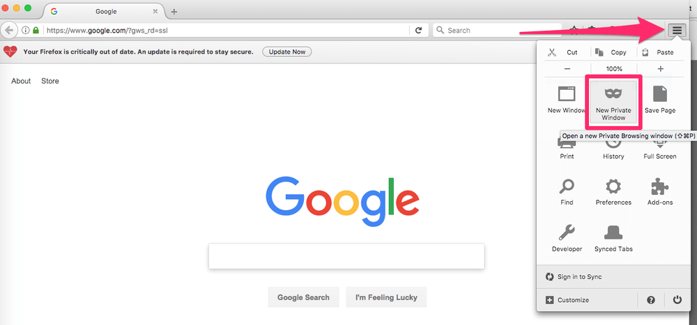 Чтобы активировать приватный режим, выберите трехстрочный значок в правом верхнем углу и выберите «Новое приватное окно». Вы также можете перейти в ФАЙЛ > НОВОЕ ЧАСТНОЕ ОКНО. Частные окна имеют значок фиолетовой маски.