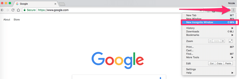 В строке меню в верхней части экрана выберите ФАЙЛ > НОВОЕ ОКНО ИНКОГНИТО. Вы также можете щелкнуть трехточечную эмблему в правом верхнем углу окна браузера, а затем выбрать «Новое окно в режиме инкогнито» в раскрывающемся меню.