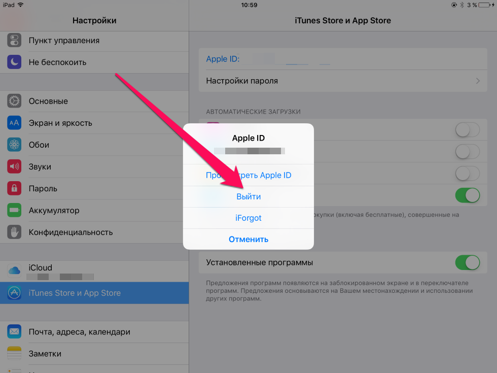 : Выйдите из идентификатора Apple на iPhone или iPad. Это можно сделать двумя способами: открыть App Store, пролистать домашнюю страницу вниз, нажать на свой идентификатор Apple ID и нажать «Выйти» или в основном меню зайти в «Настройки», найти там идентификатор Apple и нажать на иконку.