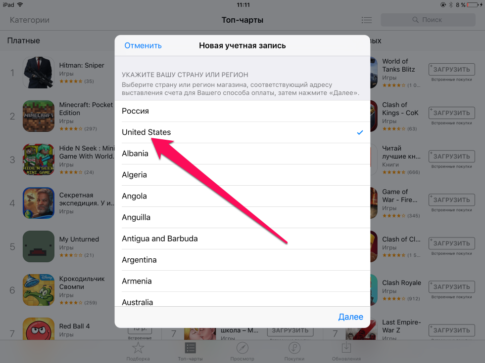 2Выбираем страну проживания: США, одну из европейских стран, Индонезию или иное государство, где официально вышло приложение, и заводим аккаунт Apple в официальном магазине приложений App Store для выбранной страны.