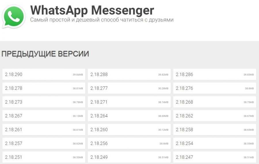 Старых версий мессенджера на официальном сайте Ватсап нет — разработчик не заинтересован в их распространение. Тем не менее потребность установить предыдущую версию мессенджера встречается довольно часто. Предыдущие версии Ватсап можно скачать со сторонних сайтов