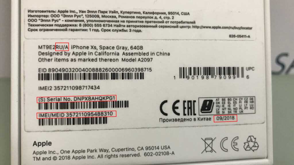 Идентичные обозначения можно найти на коробке рядом с основной информацией об устройстве вроде цвета и комплектации. Само собой, это актуально только для полностью нового устройства, купленного в официальном магазине, тогда как б/у модели зачастую продаются без оригинальной упаковки.