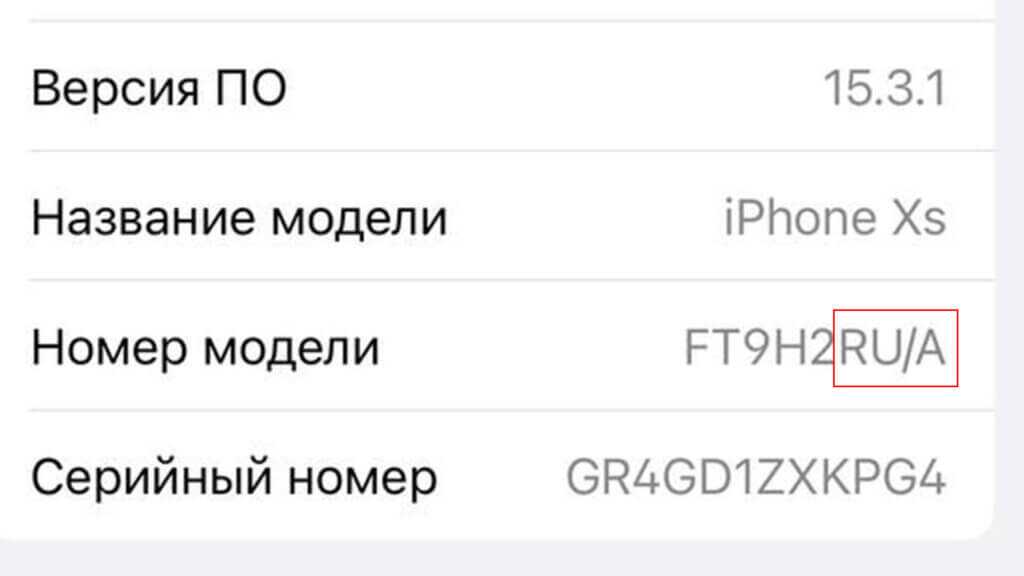 Ознакомившись с указанными ранее полями, среди которых наиболее точным вариантом будет пункт «Номер модели» в системных «Настройках», необходимо оставить только один или два последних символа перед разделительной чертой «/». Например, для России это по умолчанию «RU», что можно понять и без дополнительных уточнений, в то время как модели для США имеют метку «LL».