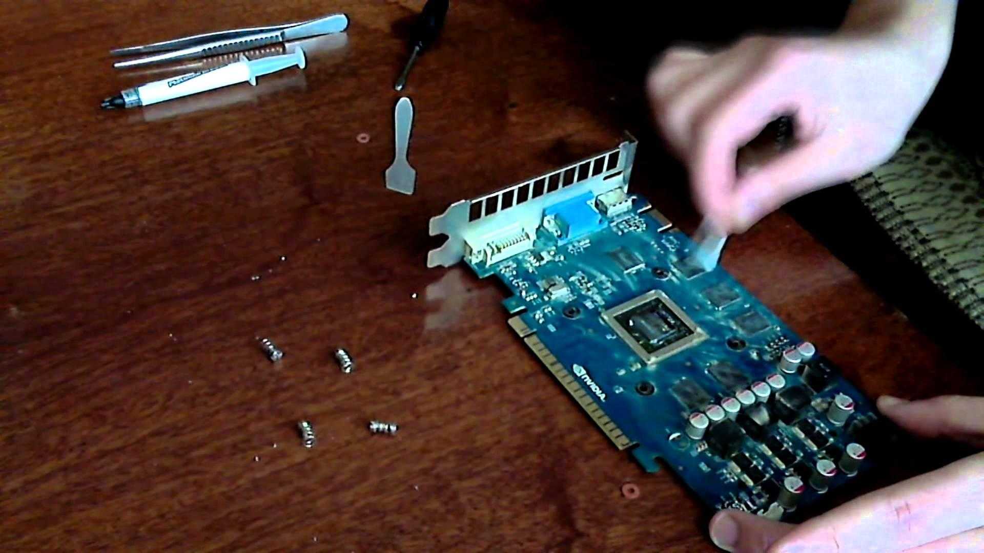 - тщательно очистить вентиляторы и другие части видеокарты кисточкой (обычной для рисования или строительной).
