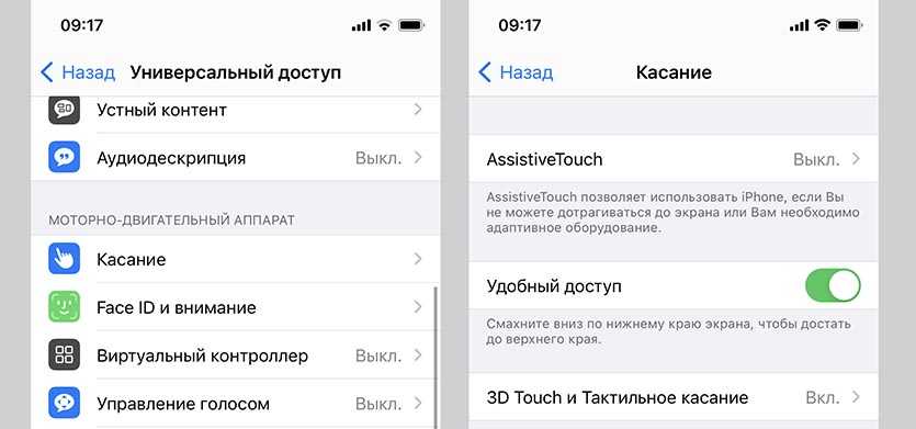Чтобы дотянуться до верха экрана было проще, включите опцию Удобный доступ (Настройки – Универсальный доступ – Касание). После этого сделайте свайп вниз на нижнем индикаторе домашнего экрана и интерфейс сдвинется для доступа к верхним элементам.