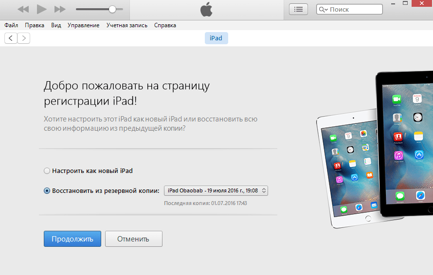 - Настроить устройство как новое — т.е. установить настройки по-умолчанию, присвоить новое название, создать новую резервную копию с новым именем (при этом старая копия, если она имеет место, не удалится, а будет располагаться на жестком диске под старым названием). Этот вариант крайне рекомендуется использовать, если вы восстановили устройство после серьезных ошибок, т.к. при восстановлении из резервной копии вместе с данными могут восстановиться и проблемные зоны.