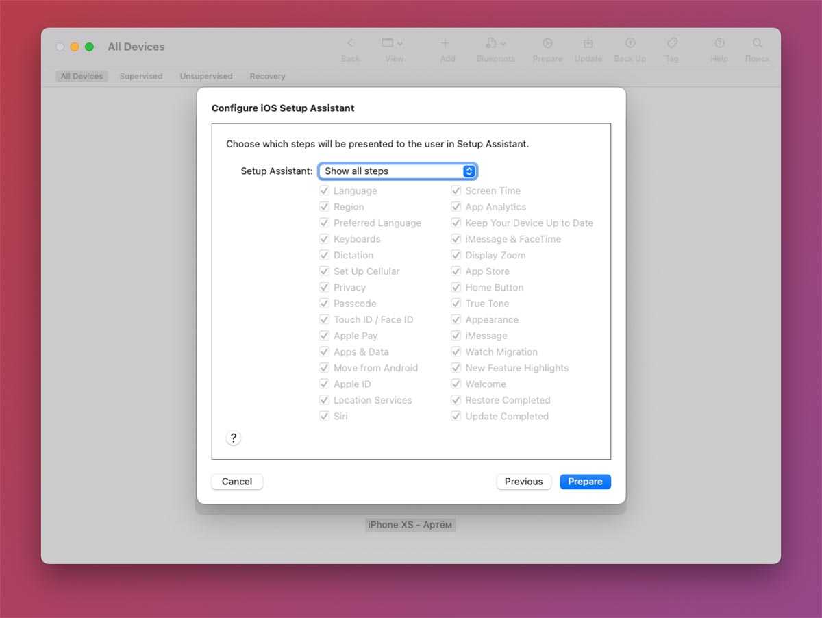 1. Запустите приложение Apple Configurator 2 на Mac и подключите iPhone к компьютеру при помощи кабеля.