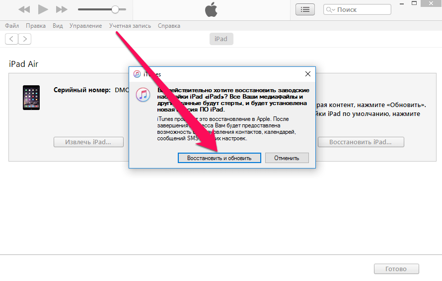 - Восстановить (Restore) — вариант, используемый при необходимости исправления ошибок в работе устройства, понижения прошивки или установки кастомной прошивки.
