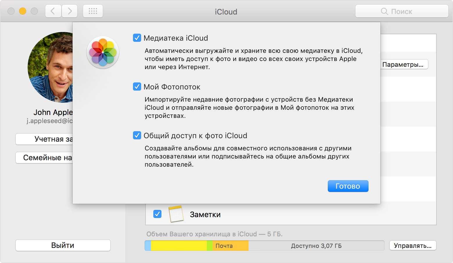 Важно, чтобы был введен тот же Apple ID, что и на iPhone, — именно так система идентифицирует вас. В окне программы поставьте галочку около надписи «Фотографии» и после нажатия на кнопку «Параметры…» укажите, где на компьютере будет располагаться «Фотопоток»