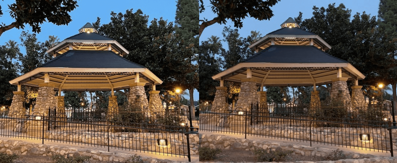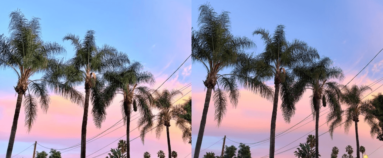Например, на двух фотографиях выше изображена беседка в парке вечером, во время заката. На обычном фото JPEG (слева) ярко-синее небо, из-за чего создается впечатление, будто снимок сделан днем (но это не так). Свет также несколько размыт. Текстура также кажется слишком резкой, а цвет намного более желтым, чем должен быть. Версия ProRAW (справа) имеет более гладкие текстуры, более реалистичные цвета с меньшим количеством засветов и приглушенное небо.