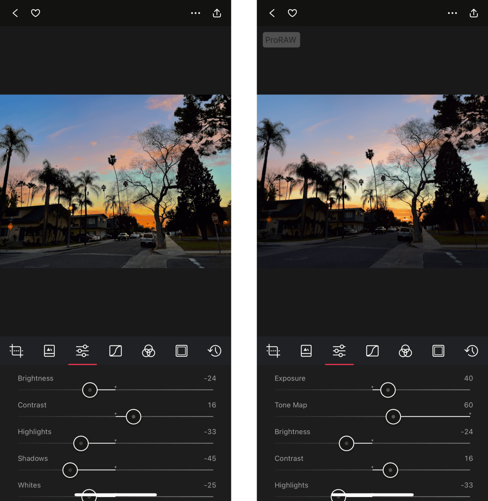 Самый сок в ProRaw — возможности продвинутого редактирования. Это, например, приложение Darkroom