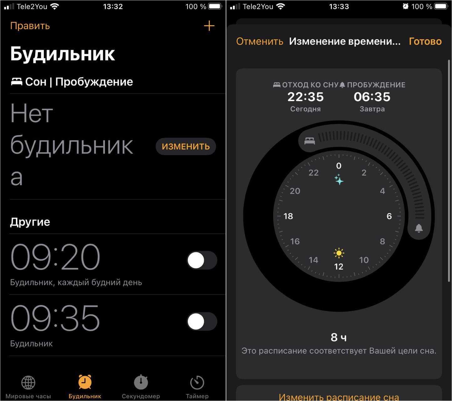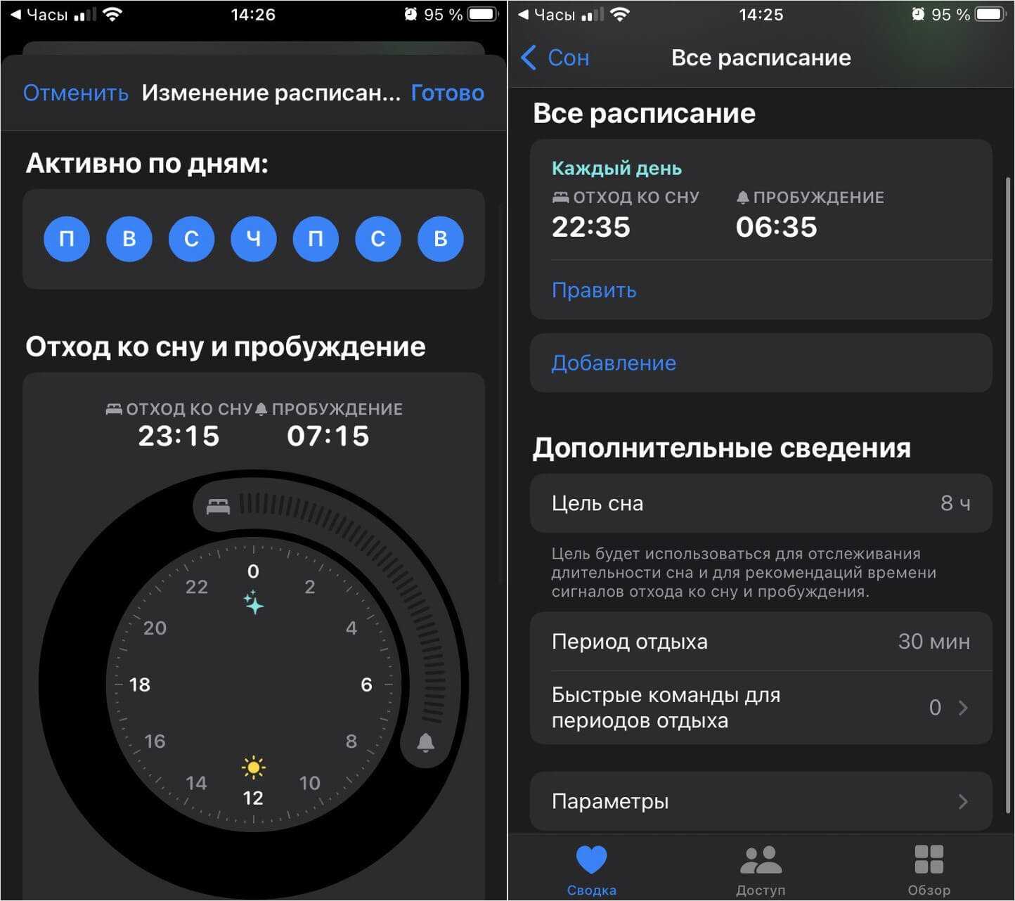 А вот менять расписание сна нужно в приложении «Здоровье»: тут вы сможете добавить дополнительный будильник или выставить дни, в которые он должен сработать, а также другие дополнительные параметры. Например, активацию фокусирования «Сон»: она включится автоматически, когда наступит время отхода ко сну. Что можно настроить еще?