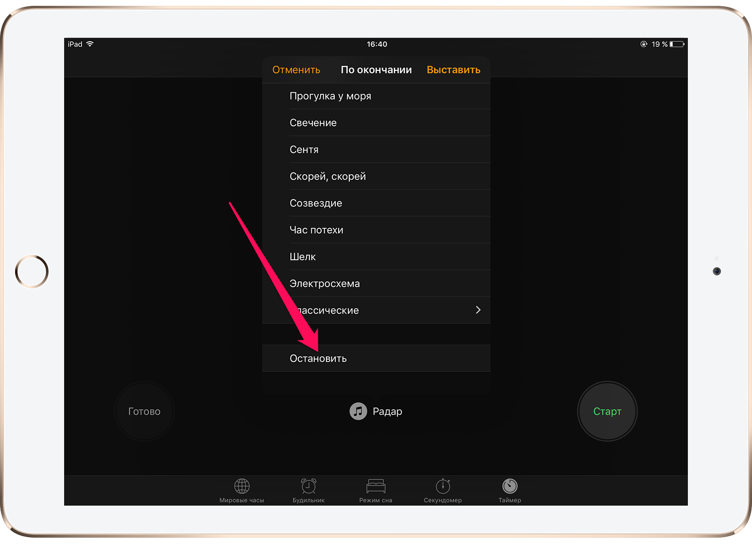 Есть мнение, что стандартным таймером сна в iOS мало кто интересуется по той простой причине, что он очень качественно «спрятан» в настройках устройства и фактически нигде и никак не упоминается. Более того, даже названия такого в iOS вы не найдете. Но таймер сна в этой системе все же есть. Находится он в приложении «Часы» и называется… ТАЙМЕР. Да, это , который, тем не менее, может не просто просигналить по истечению заданного периода, но и умеет в нужное время остановить любой плеер.