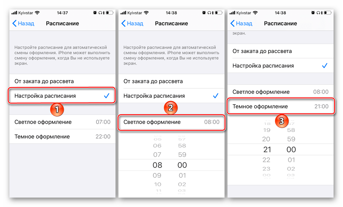 Темы можно настроить таким образом, чтобы они менялись в зависимости от времени суток: днем — светлая, вечером — темная. Автоматическая активация основывается на принципе Night Shift, посредством которого пользователь может самостоятельно задавать определенные временные промежутки
