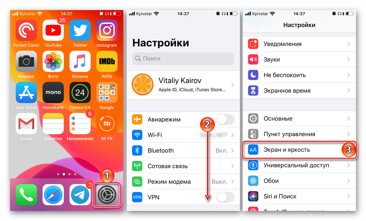 - Открыть вкладку главного меню «Экран и яркость».