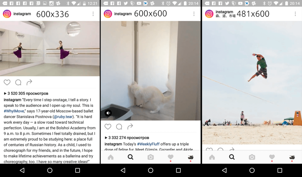 Однако если оригинальное видео вы снимали не в портретном режиме, применить оптимальное соотношение сторон буде сложно. В таких случаясь стоит использовать квадратные видео со стандартным соотношением 1:1. Оптимальным разрешением здесь будет 1080 x 1080 пикселей.