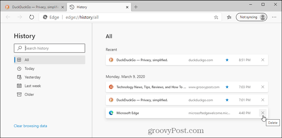 Ваша история просмотров отображается на новой вкладке, сгруппированной по периодам времени. Нажмите на период времени, такой как Cегодня или же Вчерашний день, Затем нажмите ссылку для страницы, которую вы хотите открыть на текущей вкладке.