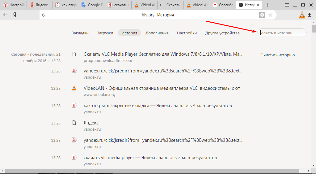 Если вы помните какую-либо часть названия интернет-площадки или начало адреса, то воспользуйтесь быстрым поиском, который находится на верхнем правом углу «Истории»: