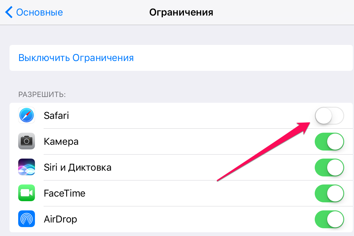 Кстати, после такой процедуры иконка Safari — может сама благополучно вернуться в «домашнее» меню. Если этого так и не произошло, то снова заходим в раздел ограничений, смотрим, включены ли они конкретно на наш браузер. Затем в пункте «Выключить ограничения» этого же раздела выбираем «Сафари». Тем самым мы открываем ему доступ прямо с главного меню и снимаем для него любые ограничения.