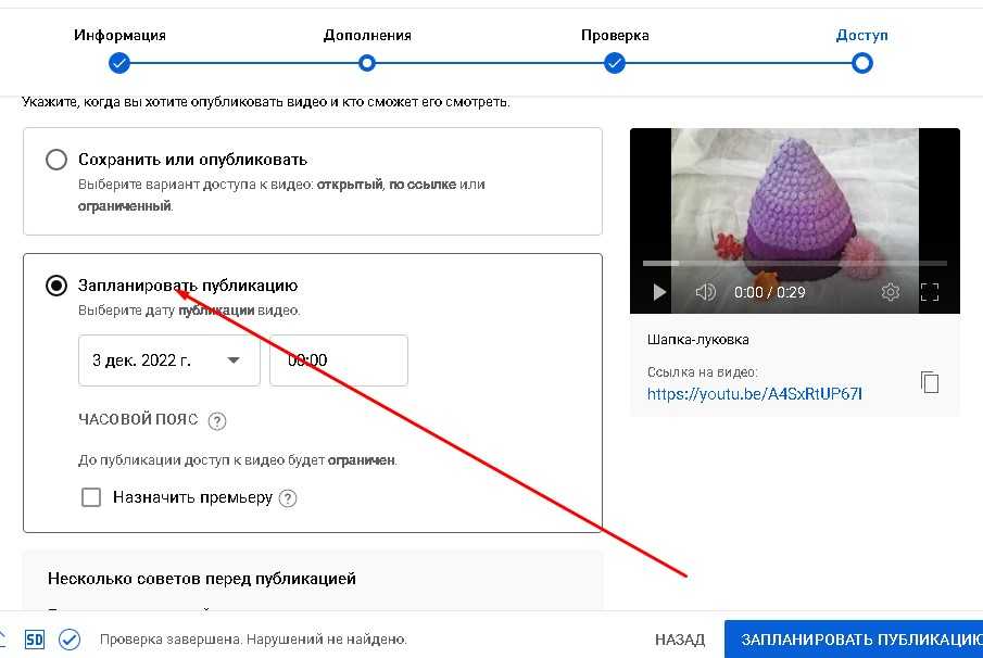 На этой же странице при желании вы можете назначить отложенную дату публикации вашего видео, заполнив соответствующую форму.