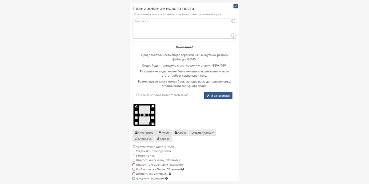 - Перегруженность сервера. Если вы публикуете видео, например, вечером, после рабочего дня, когда посещаемость ВКонтакте высокая, возможны сложности с загрузкой ролика. Попробуйте чуть позже или перенесите публикацию, например, на утреннее время — в пики вы можете столкнуться с проблемами загрузки видео на сайт.