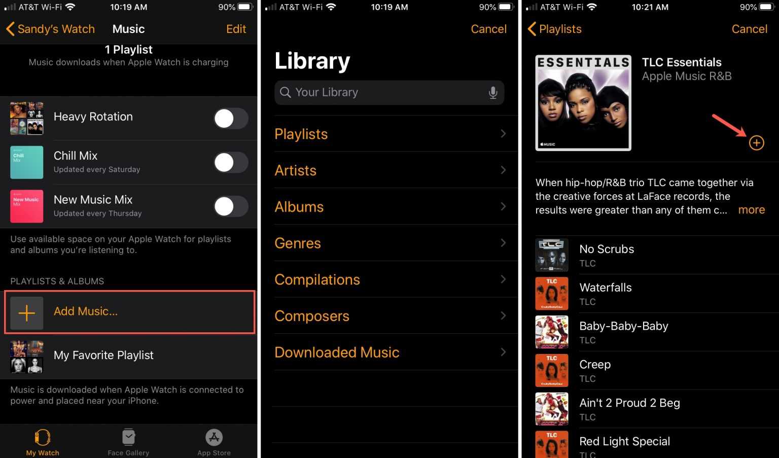 На Apple Watch можно добавлять определенные плейлисты и альбомы, используя приложение Apple Watch на iPhone. При наличии подписки на Apple Music можно также добавлять музыку прямо на Apple Watch, используя приложение «Музыка» .