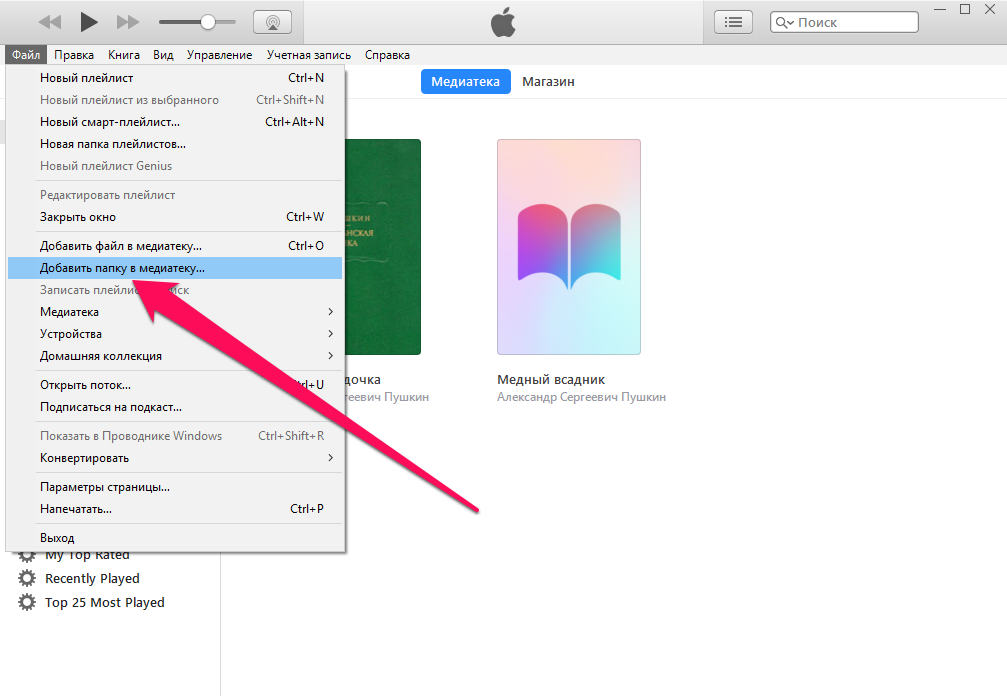 Шаг 2. Перейдите на вкладку «Медиатека» и перенесите в окно iTunes книги или документы в форматах EPUB или PDF. Если вдруг по каким-то причинам перенос не удается, добавьте книги вручную, используя меню «Файл» → «Добавить файл в медиатеку» (или «Добавить папку в медиатеку», если вы хотите загрузить сразу несколько книг, которые собраны в одной директории).