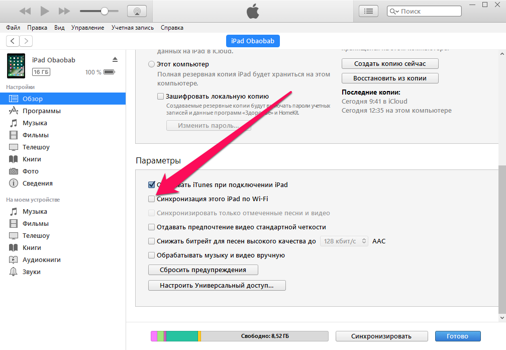Шаг 2. Выберите устройство и на вкладке «Обзор» активируйте переключатель «Синхронизация этого iPad по Wi-Fi».