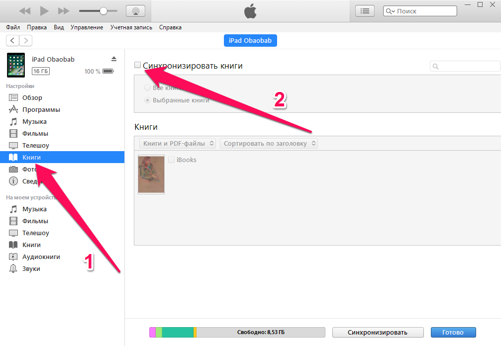 Теперь осталось только синхронизировать медиатеку iTunes с вашим устройством, делается это так: в боковом меню кликните на название вашего гаджета, в открывшемся окне найдите кнопку синхронизировать и нажмите на неё. После синхронизации книги появится на вашем устройстве, можете найти её в iBooks.