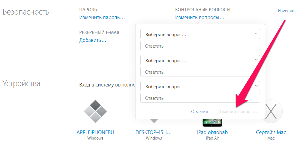 Если вы забыли контрольные вопросы, но всё-таки минимально обезопасили Apple ID указанием резервного адреса электронной почты или привязкой устройства к учётной записи iCloud, то есть простая возможность сбросить контрольные вопросы и настроить новые.