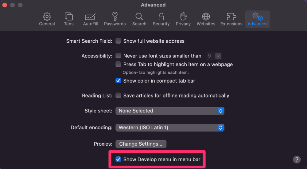 Шаг 1. Перейдите в Safari в строке меню, откройте «Настройки» в раскрывающемся меню и щелкните вкладку «Дополнительно». В окне включите параметр Показать меню «Разработка» в строке меню.