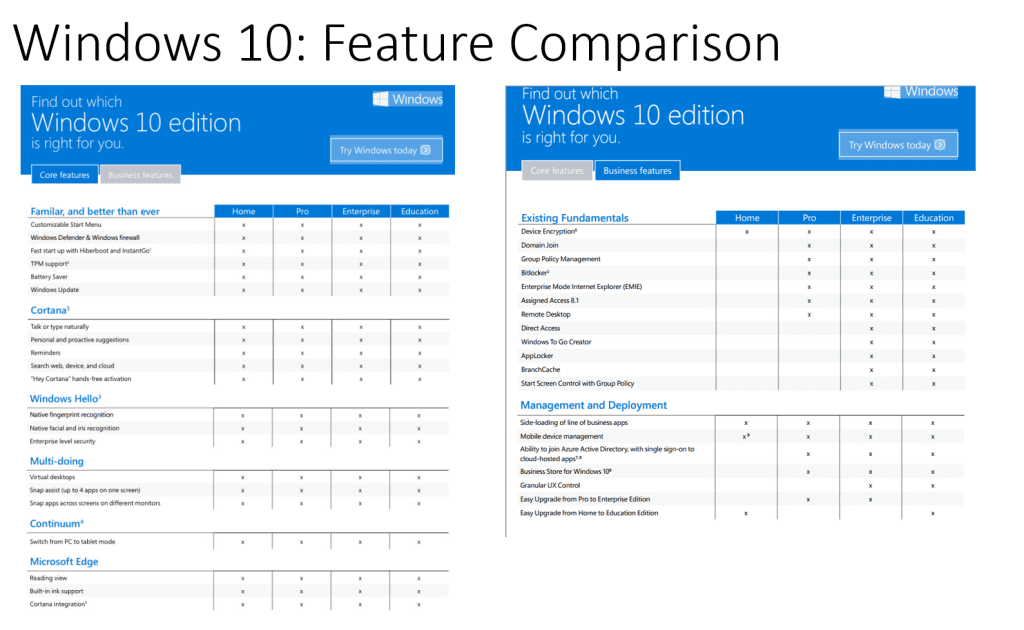 Как всегда, таблица помогает пользователю выполнить сравнение и найти отличия версий Windows 10. Можно конкретно узнать, чем Windows 10 Pro отличается от Home. Напомним, в таблице сравнения рассматриваются только десктопные версии операционной системы. Именно их чаще встречает пользователь в процессе работы за компьютером.