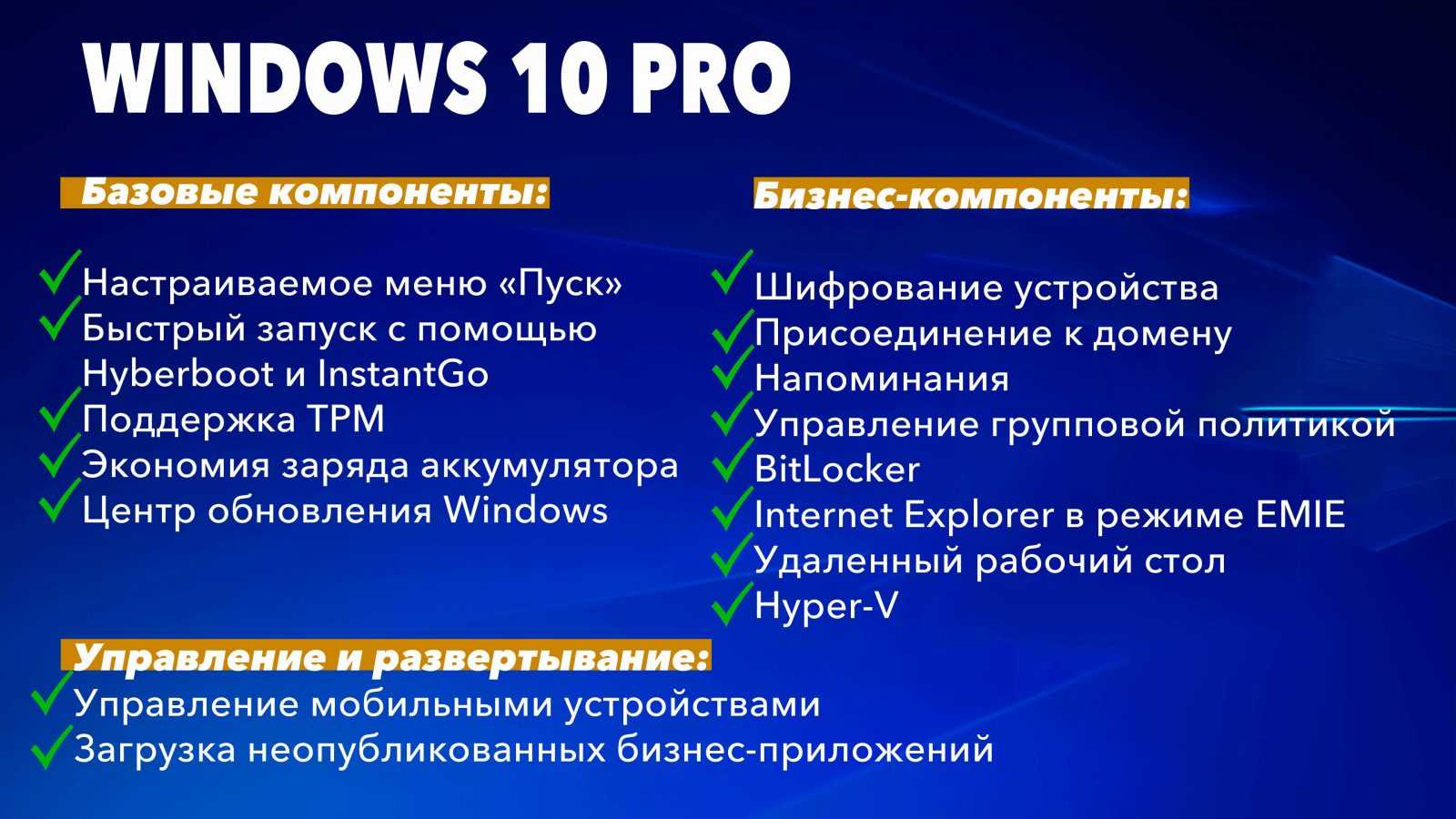 На самом деле «десятка» в оболочке Pro может многое, но большая функциональная часть в домашних условиях абсолютно бесполезная. Вряд ли обычному юзеру когда-нибудь понадобятся удаленный рабочий стол, виртуальные жесткие диски Hyper-V или BitLocker. Хотя, ситуации бывают разные, но, опять же, любой компонент можно докупить и пользоваться им в редакции для домашнего пользования.