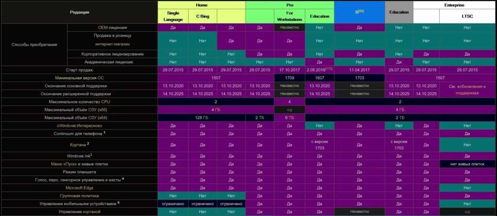 Основные характеристики версий Windows 10