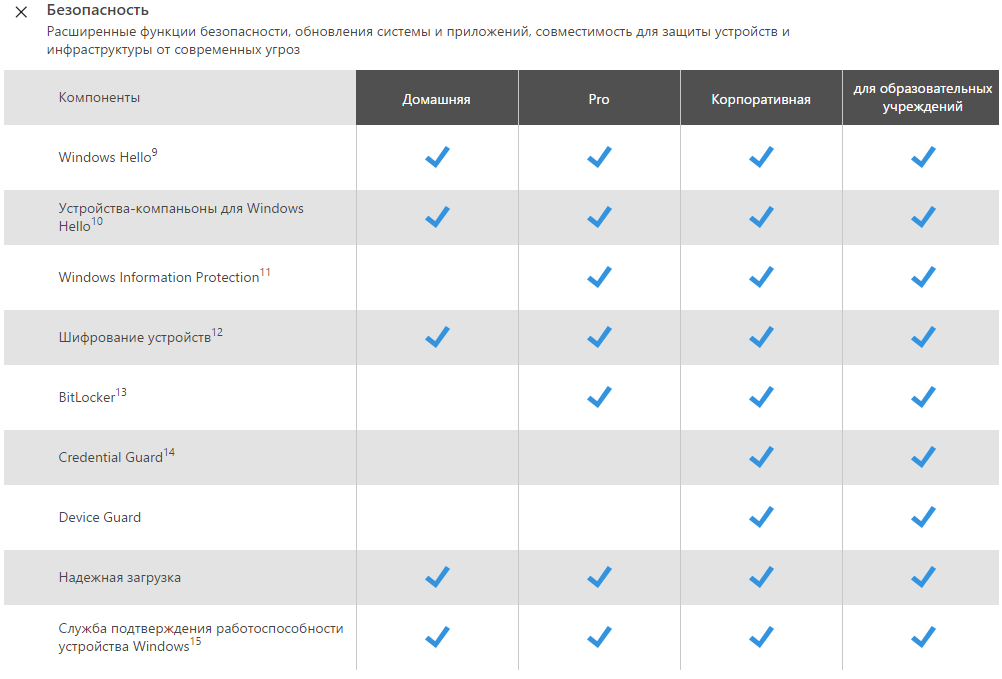 Не думаю, что в таблицу стоит добавлять функции, которые присутствуют во всех версиях Windows 10. На сайте Microsoft указывается антивирусная программа Защитник Windows, как функция, которая в домашней и профессиональной редакциях. Все изменения стоит отслеживать непосредственно на официальном ресурсе. Смотрите: Чем Windows 10 лучше Windows 7.