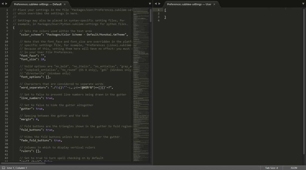 - Откройте Sublime Text и выберите меню «Preferences» > «Package Settings» > «Название плагина» > «Settings — Default».