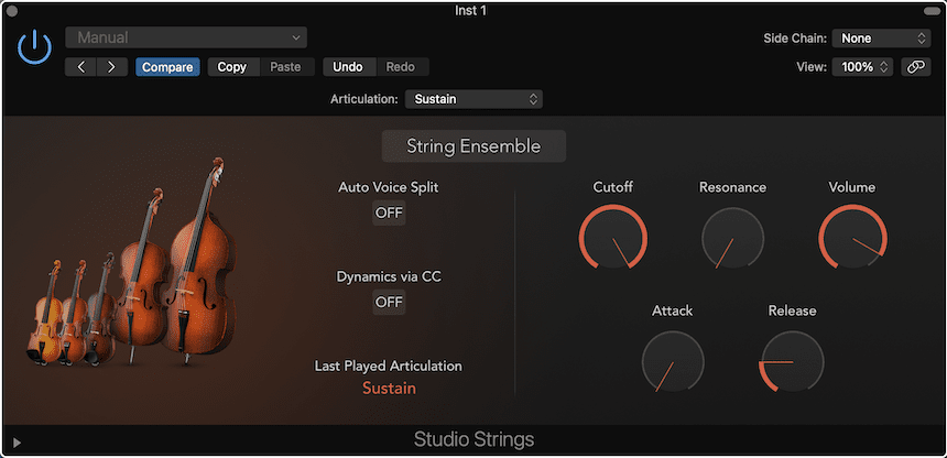 Будет отличным решением, если вам нужно получить качественно звучащие струны, записанные в студии. Примечательно то, что у вас будет возможность менять такие настройки, как Resonance, Attack, Release и другие. Кроме того, вы сможете выбирать между различными типами инструментов — скрипки, виолончели, контрабасы и альты — и секциями инструментов — струнный ансамбль, диско-струнные, небольшая секция или автор-исполнитель. Вы можете использовать виртуальный инструмент Studio Strings в Logic