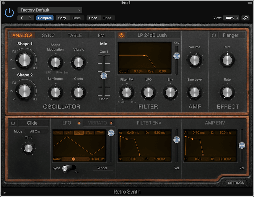 Еще один отличный виртуальный инструмент от Logic пригодится, когда вам нужны всеми любимые и известные звуки винтажного синтезатора. Retro Synth предлагает четыре оттенка классических тембров аналогового синтезатора, и все они звучат просто великолепно. Logic представляет винтажный синтезатор Retro Synth