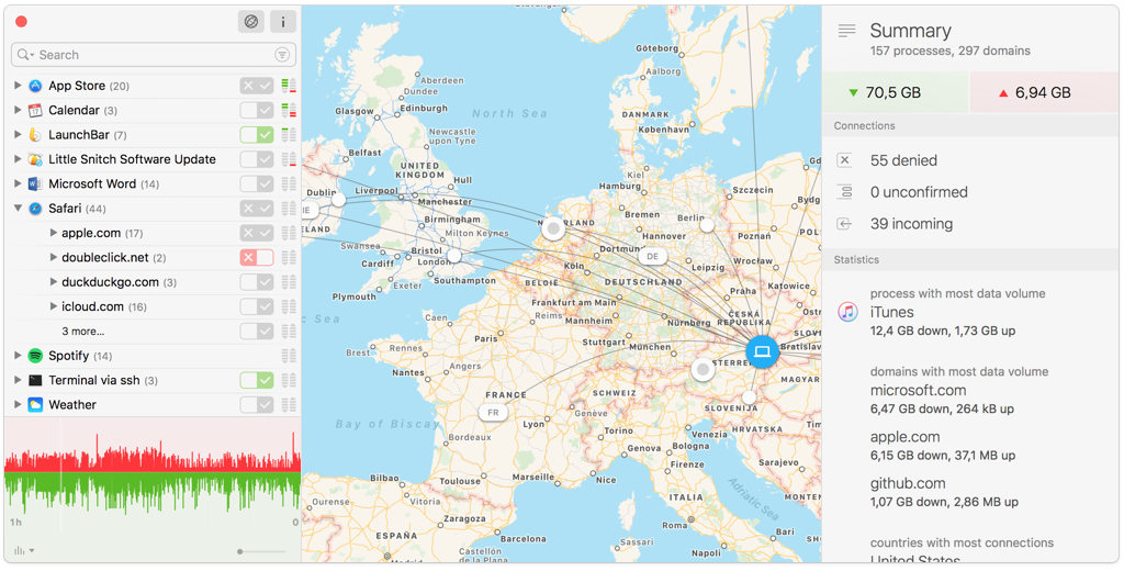 На панели управления утилиты можно отслеживать геолокацию подключений и беспрерывно наблюдать, из каких стран к вашему компьютеру пытаются подключиться, какой объем информации хотят выгрузить и из какого приложения.