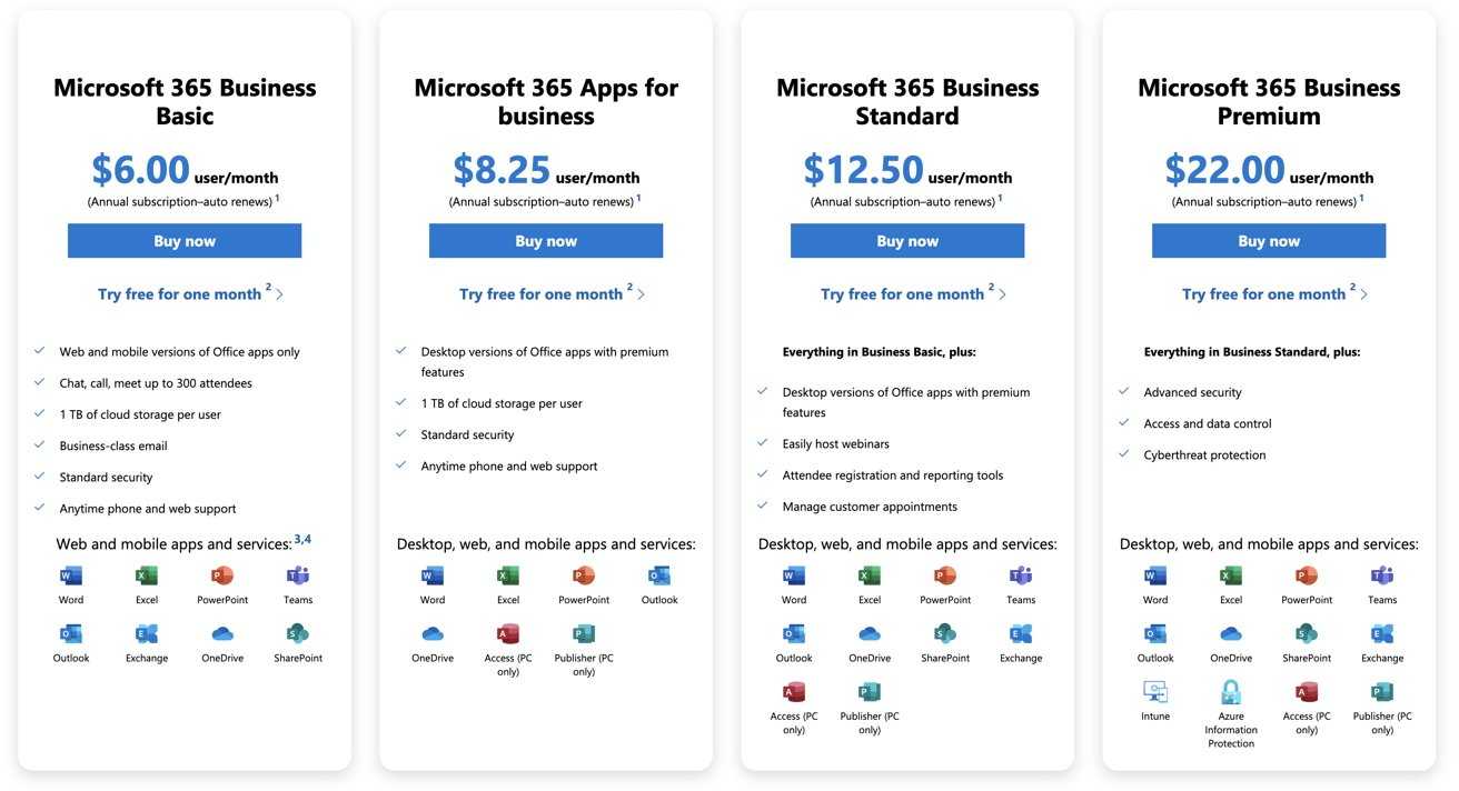 Вы получаете версии Word, Excel, PowerPoint, Teams, Outlook, Exchange и SharePoint для браузера и приложений с 1 ТБ облачного хранилища OneDrive на каждого пользователя, электронной почтой бизнес-класса, «стандартной безопасностью», а также поддержкой по телефону и через Интернет.