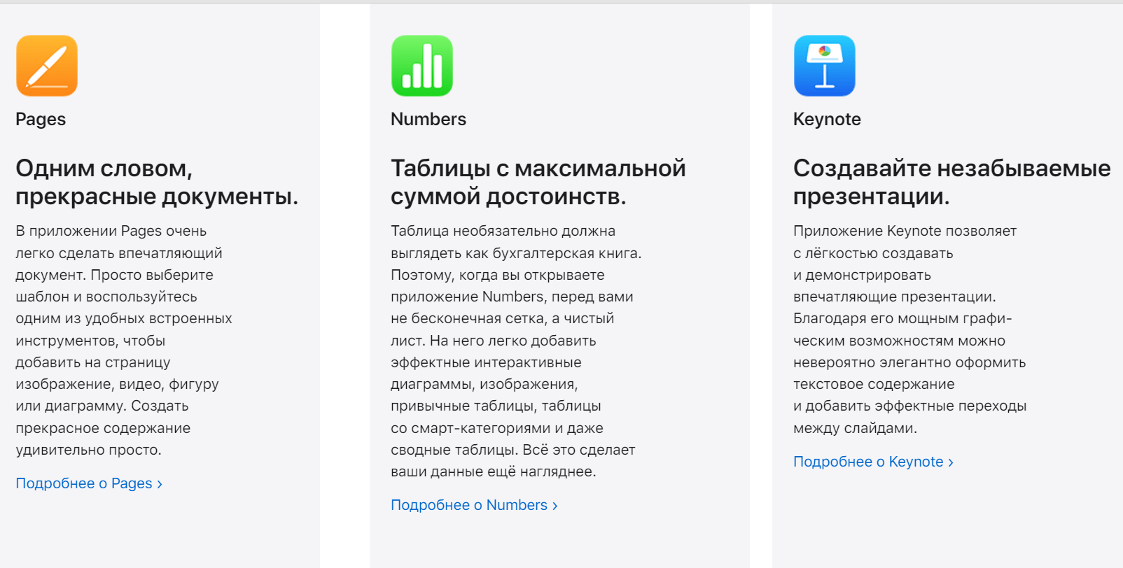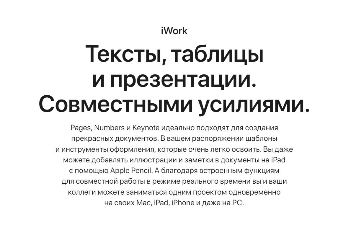 - Apple iWork — офисный пакет, специально разработанный для пользователей устройств Apple, включающий в себя текстовый редактор, таблицы и программу для создания презентаций.