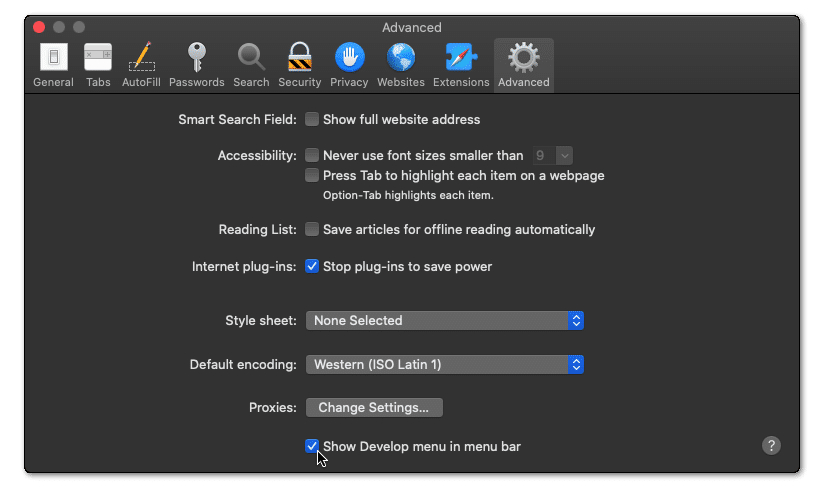 - At the following window, choose Advanced from the top bar, and tick the box next to “Show Develop menu in bar”.