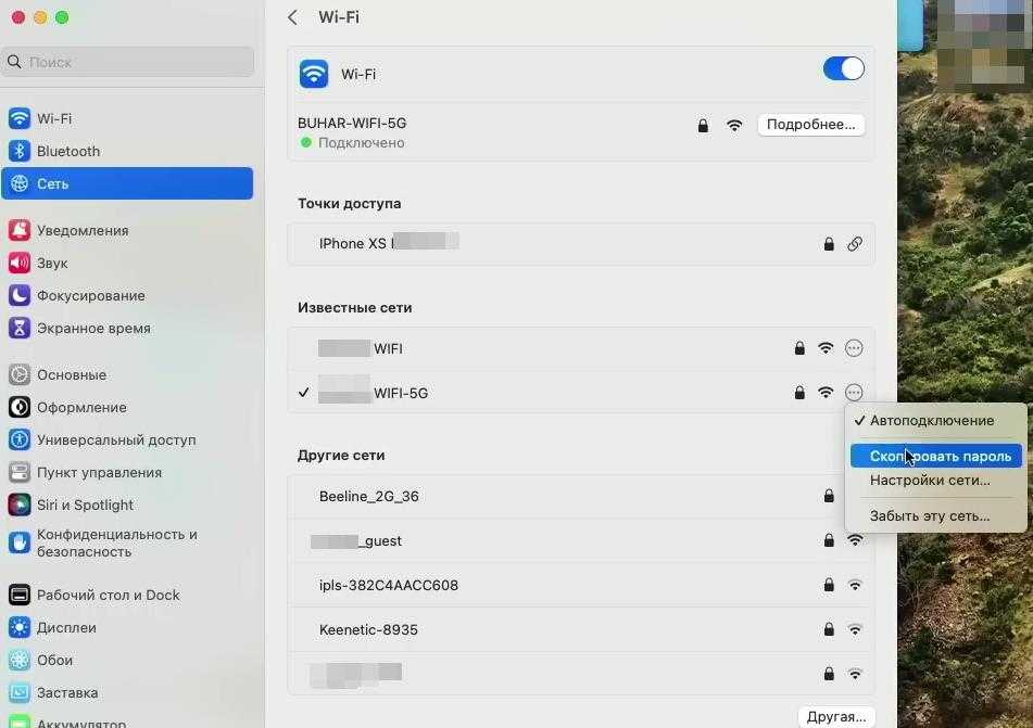 Раньше, чтобы узнать пароль от вашей Wi-Fi сети, нужно было идти в связку ключей. Теперь можно зайти в настройки сети, в меню wi-fi и выбрав нужную вам сеть, просто скопировать пароль. Пароль будет скопирован в буфер обмена.