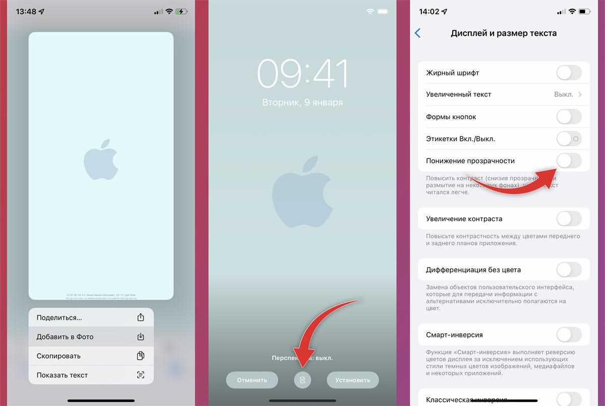 Не забывайте отключать parallax (кнопка Перспектива при выборе обоев), если этого требует картинка. Кроме этого отключите опции: Настройки – Обои – Затемнение обоев и Настройки – Универсальный доступ – Дисплей и размер текста – Понижение прозрачности.