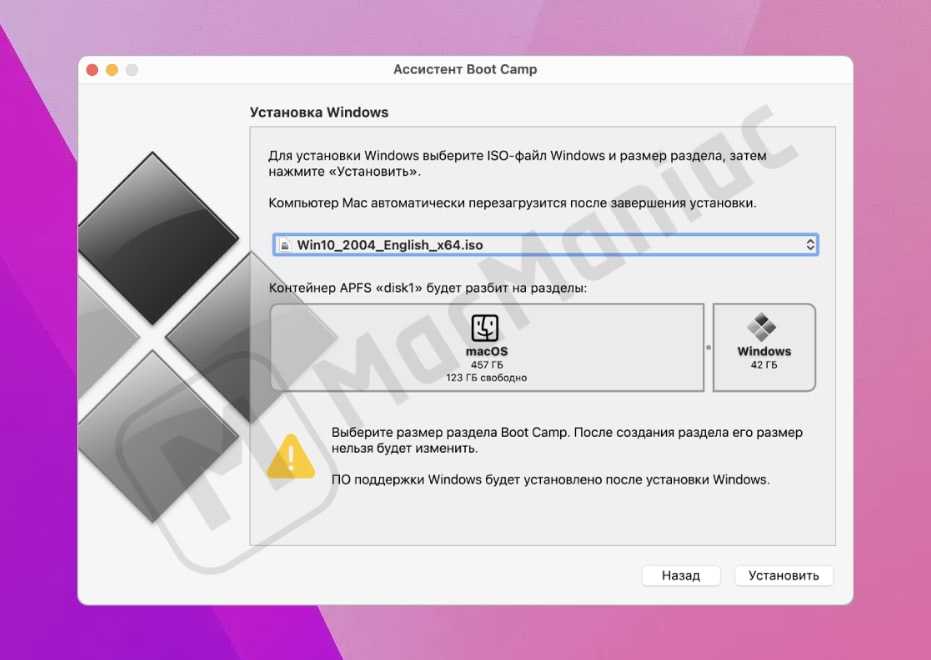 Также обратите внимание, что изменить размер раздела в дальнейшем будет невозможно! Для изменения размера раздела BOOTCAMP будет нужна полная переустановка Windows
