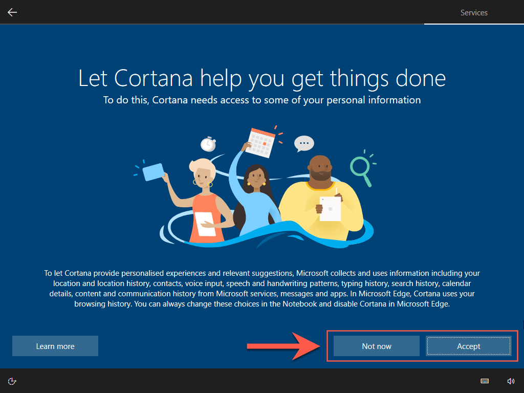 Once the Windows Setup finishes installing Windows 10, you must specify your language, keyboard, and privacy preferences. You must also create a Windows user account.