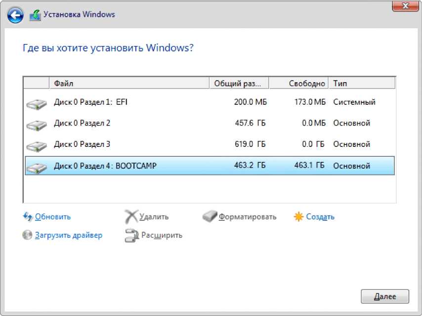 Откроется привычное окно установки Виндовс. Когда система спросит, куда установить Windows, выбрать раздел «BOOTCAMP». Кнопка «Далее» будет не активна, поскольку предварительно эту область нужно отформатировать.