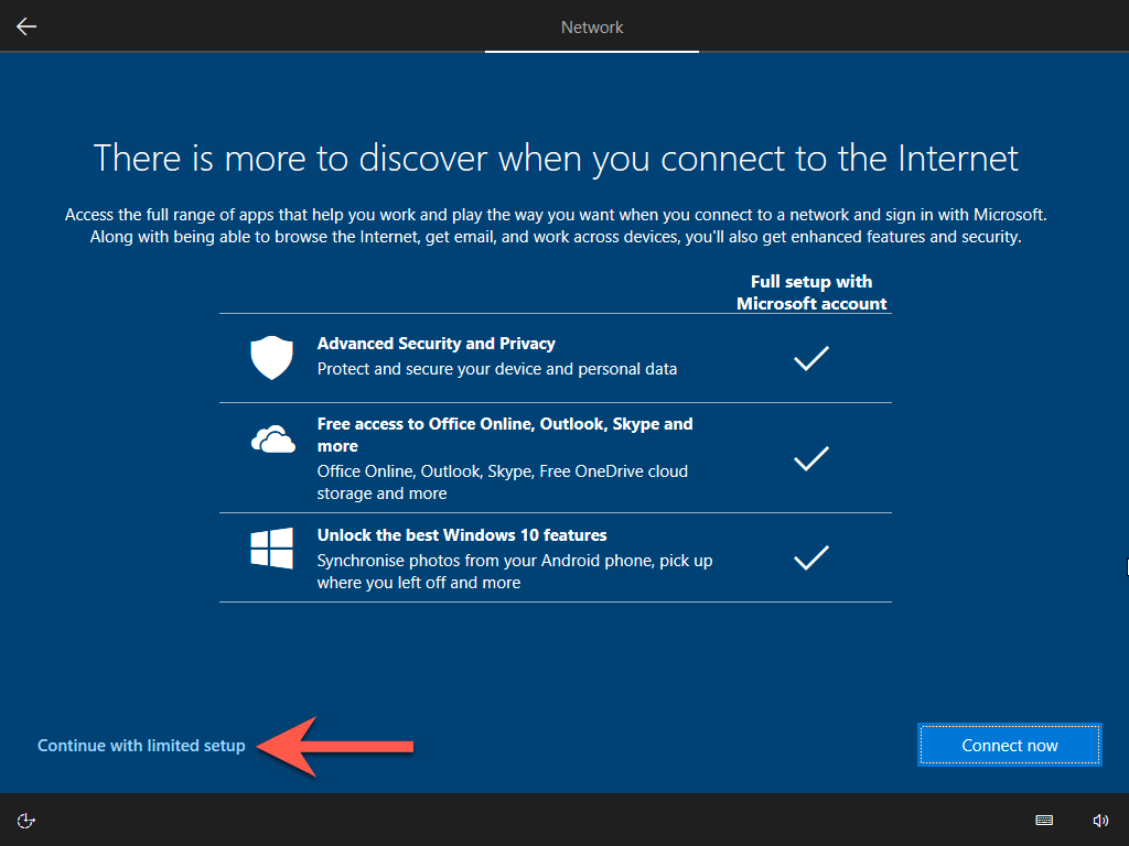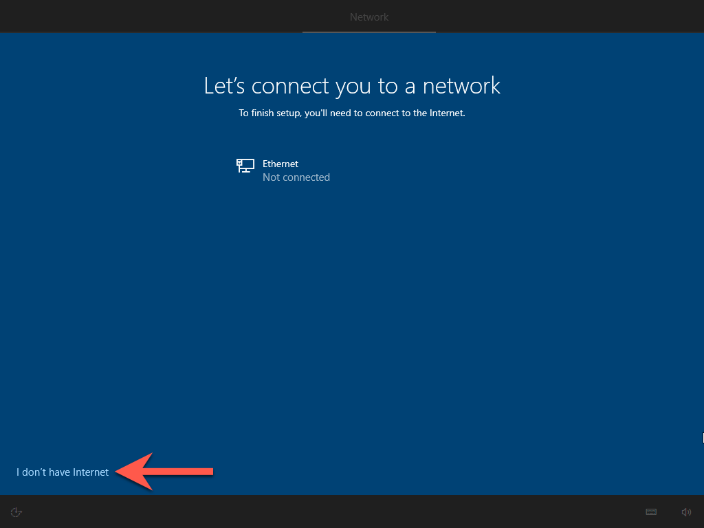 Note: Windows Setup will not connect to the internet due to missing network drivers. You can restore online connectivity after reaching the Windows 10 desktop.